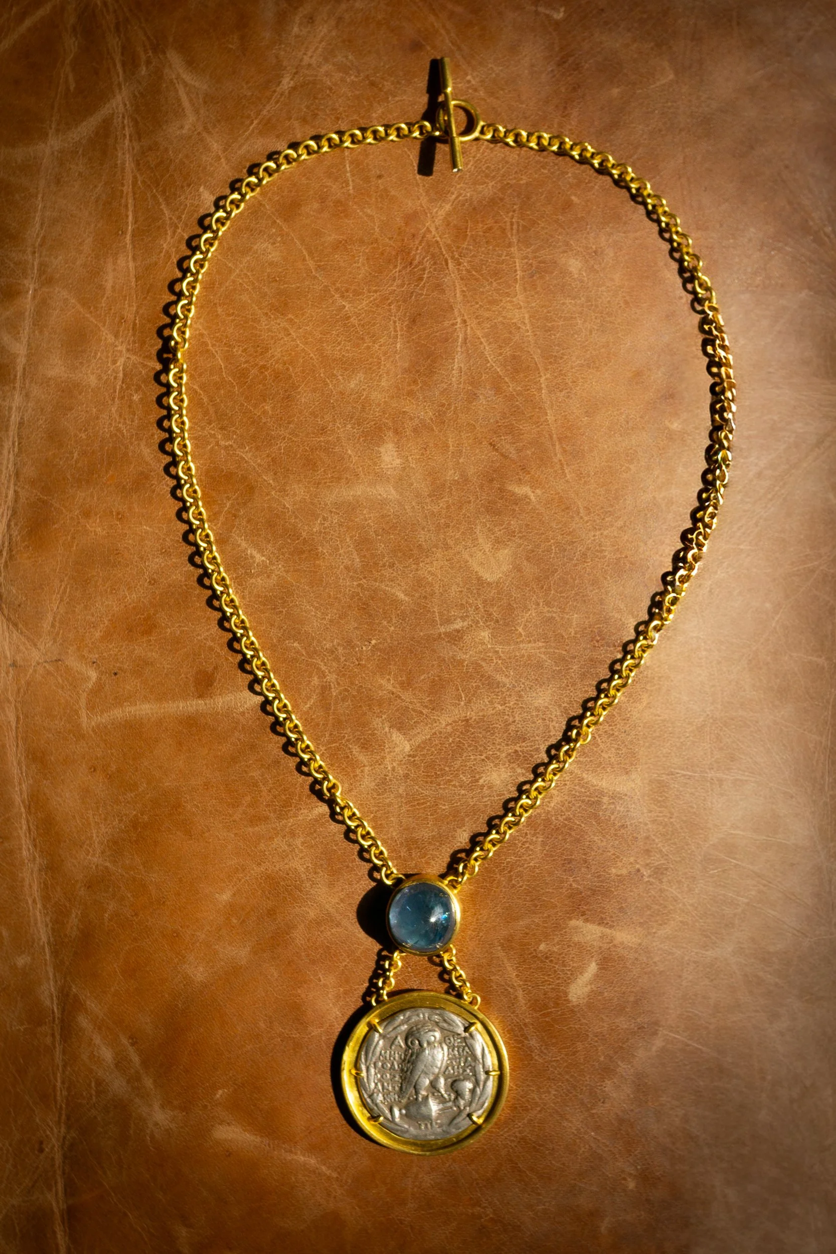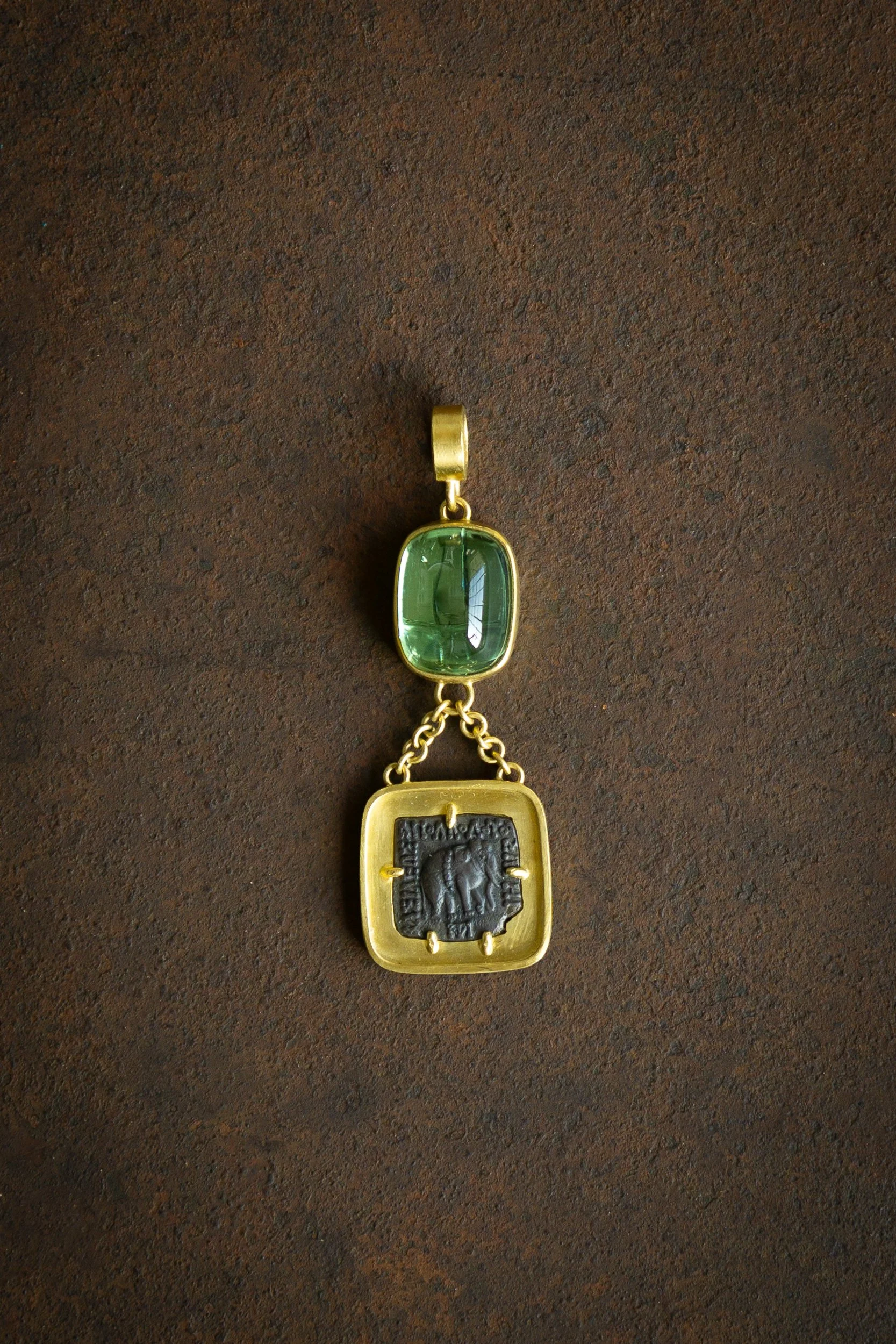 22k gold, tourmaline, ancient coin