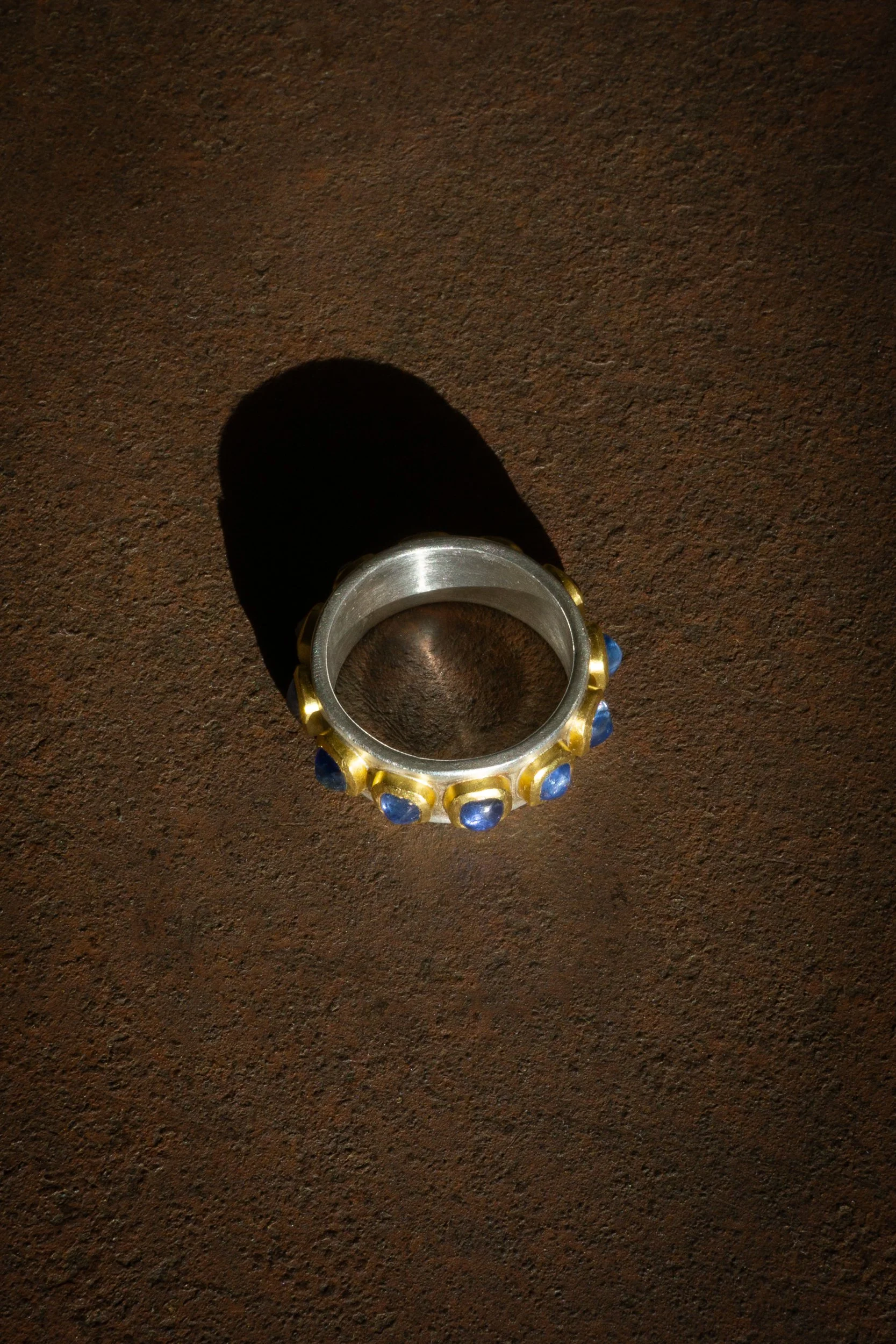 22k gold, fine silver, sapphires